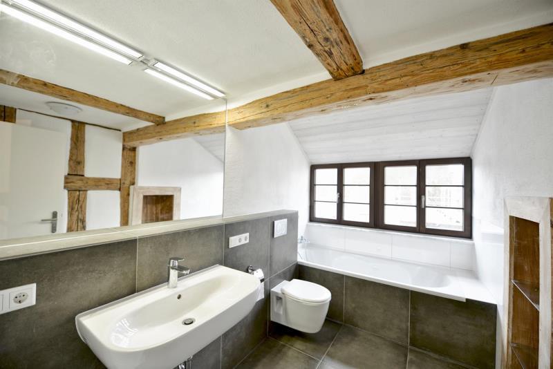 Das historische, denkmalgeschützte Anwesen aus dem Jahr 1660 wurde 2016 hochwertig und umfassend kernsaniert - ein echtes Schmuckstück! Bei der Sanierung wurden größtenteils natürliche und mineralische Baustoffe verwendet. Es wurde besonders darauf geachtet die historischen Besonderheiten, wie das fachwerkstypische Sichtfachwerk, Balkenbohlendecken und Sandsteinwände zu erhalten und modern zu ergänzen durch bodentiefe Fenster, Glastüren und moderne Raumaufteilungen. Weiter ist hervorzuheben, das die Raumhöhe im Erdgeschoss 2,80 m beträgt. Eine massangefertigte Stahltreppe verbindet das Obergeschoss mit dem Dachstudio. Die hochwertige Innendämmung sorgt für eine angenehme Raumtemperatur zu allen Jahreszeiten. Das Einfamilienhaus verfügt über insgesamt 6 Zimmer verteilt auf 3 Etagen (EG, OG und DG). Zum Anwesen gehört ein eigener Garten mit Terrasse und Pergola. Zwei Stellplätze vor dem Haus gehören zu dem Objekt und sind im Kaufpreis des Hauses in Höhe von EUR 798.000,-- enthalten. Ausstattung: - Alle Wohnräume, Küchenbereich und Flur mit Holzböden und Dielen ausgestattet - Eingang und Bäder edel und großformatig gefliest - Küche mit moderner Einbauküche (weiß) - Tageslichtbad im EG mit begehbarer Dusche, Waschbecken, WC sowie Bidet - Tageslichtbad im OG mit Badewanne, Waschbecken und WC - Ausgebautes Dachstudio - Abstellraum verfügbar - Kamin im Wohnbereich - kleiner, historischen Gewölbekeller - Badezimmer mit Fußbodenheizung - Gas-Zentralheizung