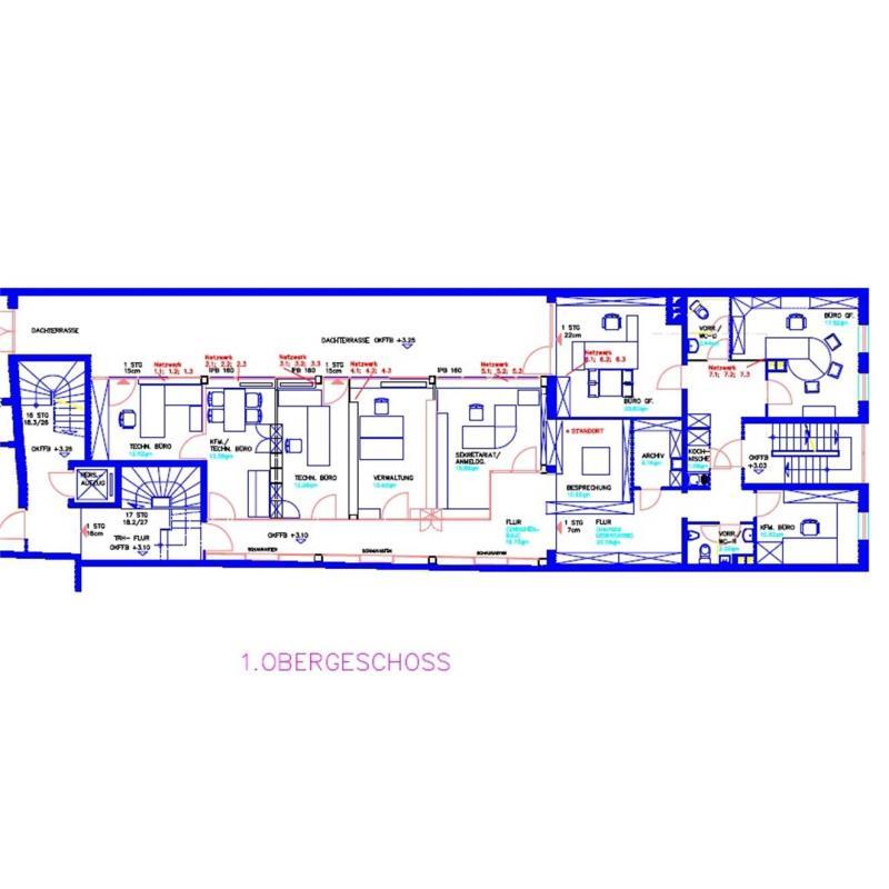 Die angebotene Bürofläche befindet sich im 1. Obergeschoss in eines Geschäftshauses in absoluter Innenstadtlage Die gesamte Fläche ist ca. 182 m² groß und teilt sich wie folgt auf: - 8 Räume (zw. 10 m² - 20 m²) - 2 Nebenräume (Besprechnung und Archiv) - 2 voneinander getrennte WCs - Kochnische - Flur (Bildbeschriftung entsprechend Gundriss) Ausstattung: - Empfangsbereich, Räume, Nebenräume mit Laminat ausgestattet - WCs gefliest - Dachterrasse (Zugang über drei Räume) - Aufzug Der angegebene Mietpreis bezieht sich auf den jetzigen Zustand. Das Einziehen oder Entfernen von Zwischenwänden und/oder weitere Umbaumaßnahmen sind grundsätzlich denkbar. Dies ist abhängig von der Vertragslaufzeit und gegen Aufpreis möglich. Die Nebenkosten in Höhe von ca. EUR 500,-- monatlich beinhalten einen Heizkostenabschlag, jedoch keinen Abschlag für Strom. Die Anmeldung (Strom) muss eigenständig beim örtlichen Energieversorger erfolgen, die Abschlagszahlungen erfolgen direkt mit dem Energieversorger. Alle genannten Preise sind Nettopreise, d.h. vom Mieter ist zusätzlich auf Miete und Nebenkosten die gesetzliche Mehrwertsteuer in Höhe von 19% zu zahlen.
